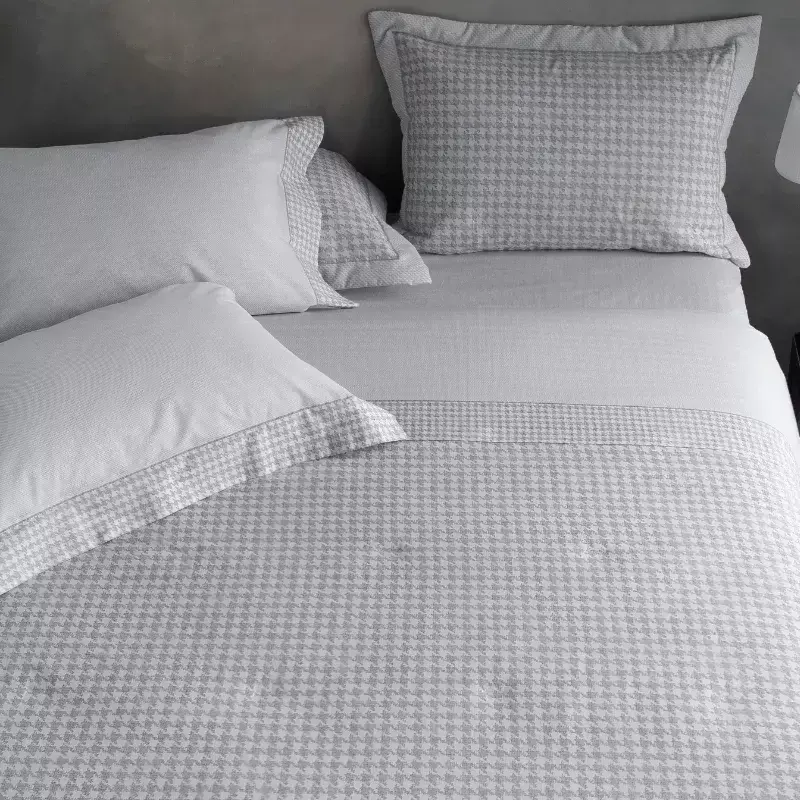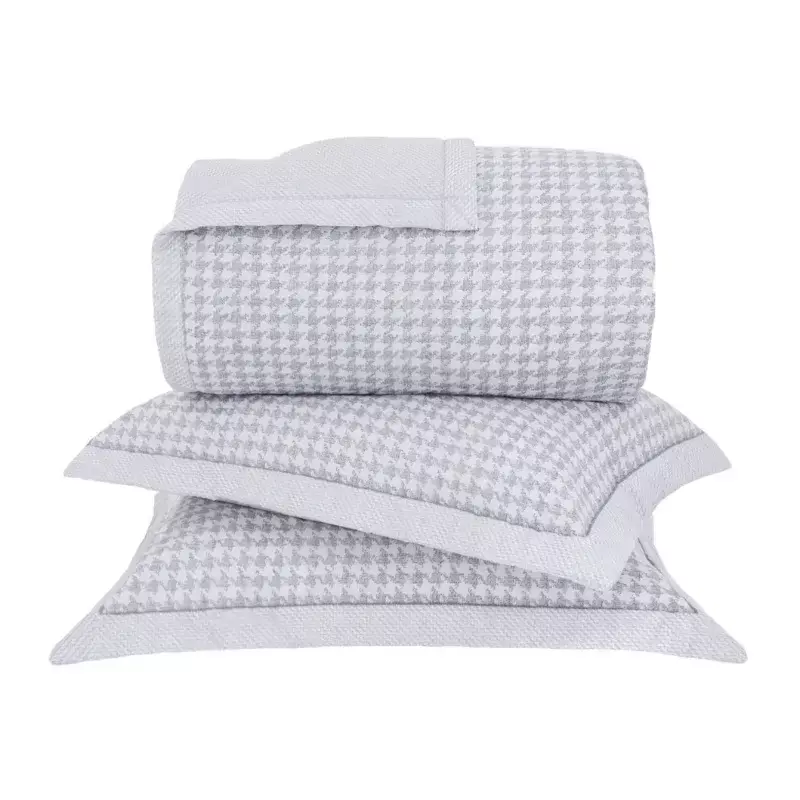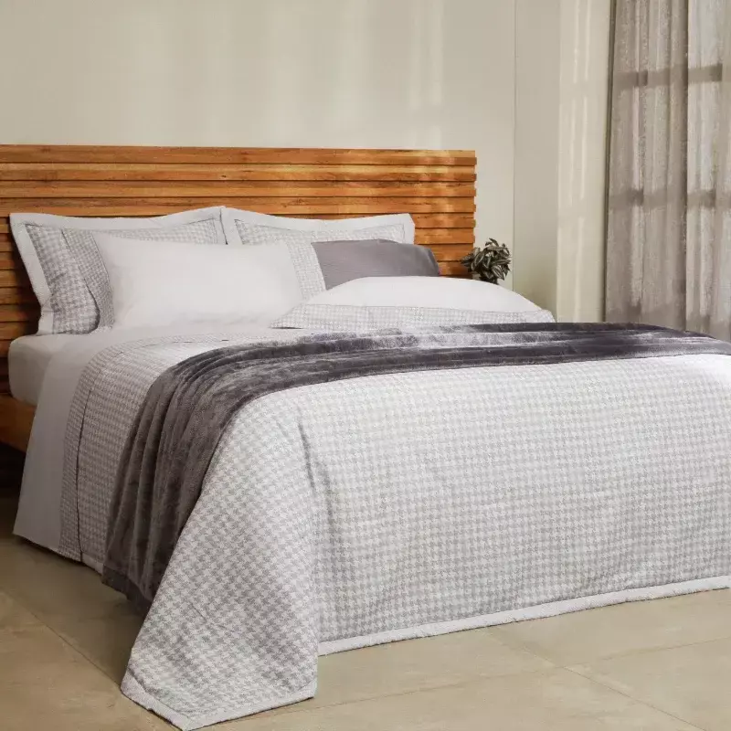 A Coleção Pied Poule traz uma abordagem moderna e sofisticada para o padrão tradicional, são delicadamente enquadrados por esse padrão de alta costura, criando um jogo de cores sutis em tons de cinza que adicionam neutralidade e suavidade ao ambiente. você transformará seu quarto, elevando tanto o estilo quanto o conforto a um novo patamar de sofisticação. É a escolha perfeita para uma noite de sono envolta em elegância.